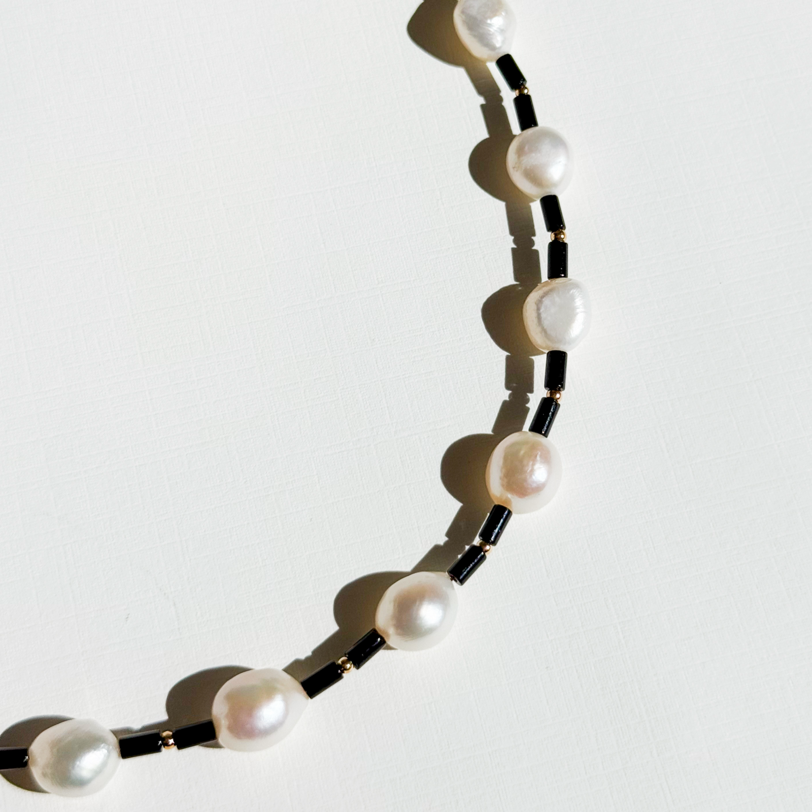 The Ivana Necklace, meticulously handmade in Raleigh, features lustrous freshwater pearls paired with elegant black tubular beads and a delicate 2mm gold-plated bead. This sophisticated accessory offers timeless charm and is perfect for layering, making it an essential addition to any refined jewelry collection.
