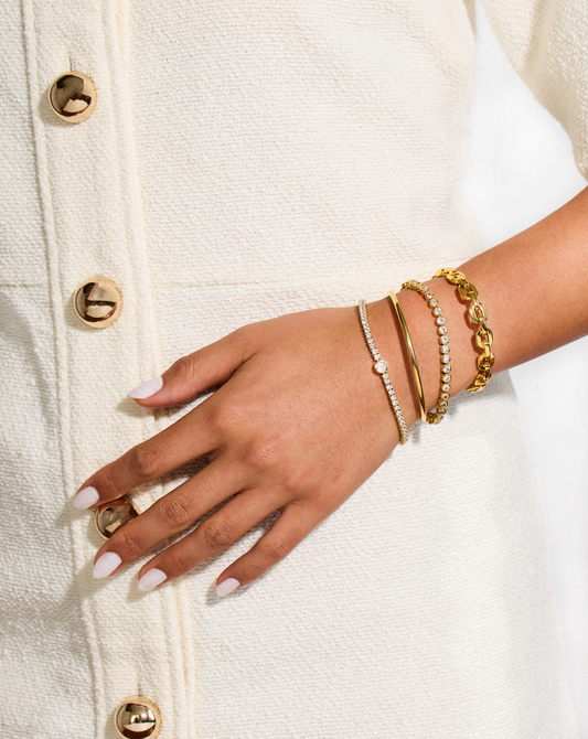 Mix and match with the Madison Bracelet Set! Featuring an elastic design, one size fits all. Wooden discs add a fun and bold touch, perfect to stack with gold bracelets. Versatile and unique, this set is perfect for adding some fun to any outfit.