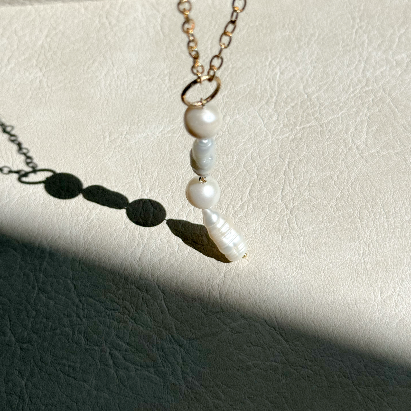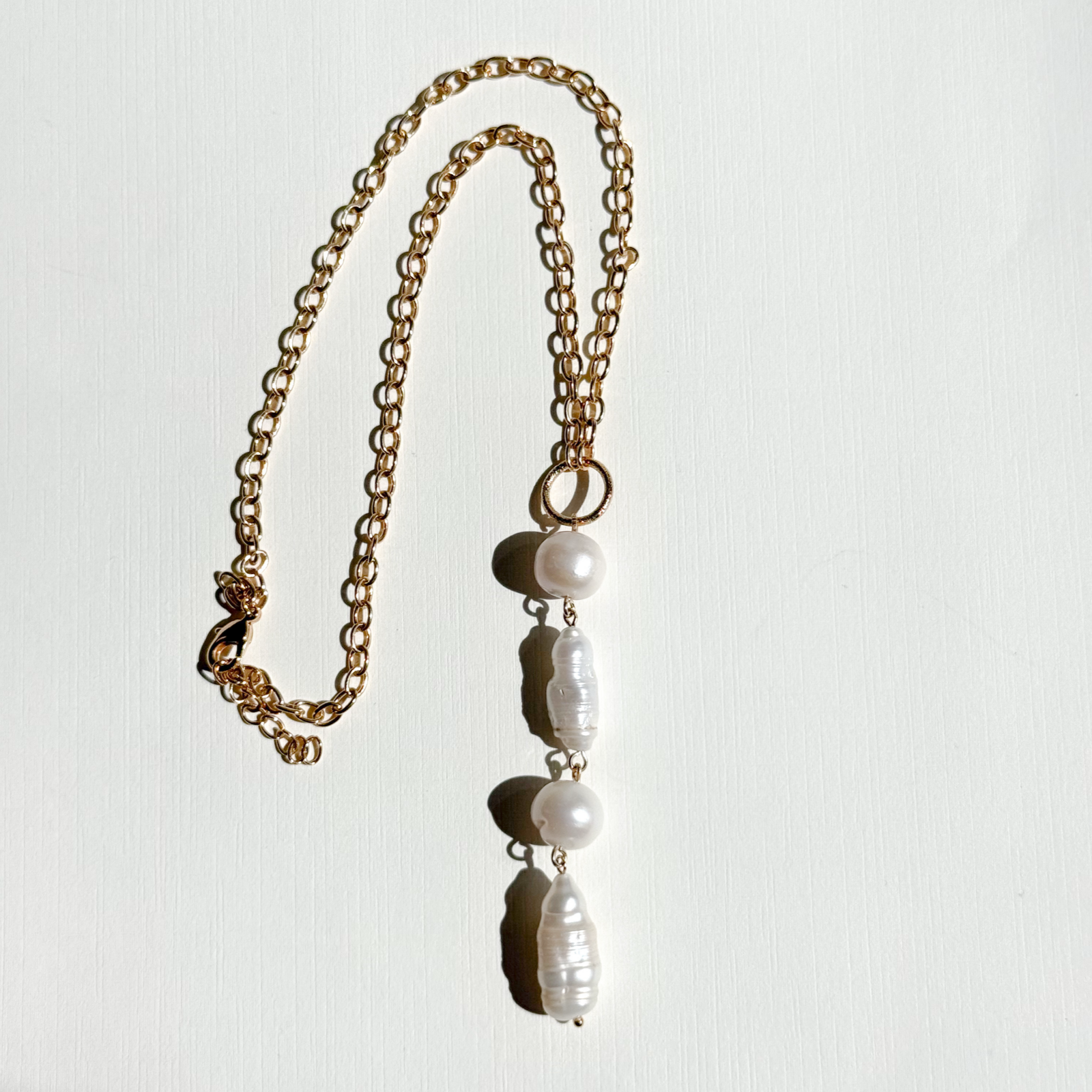 Crafted by hand in our Raleigh atelier, the Aline Lariat features naturally shaped freshwater pearls strung along an 18k gold-plated chain. This unique piece forms a graceful vertical silhouette, offering a refined statement for collectors.