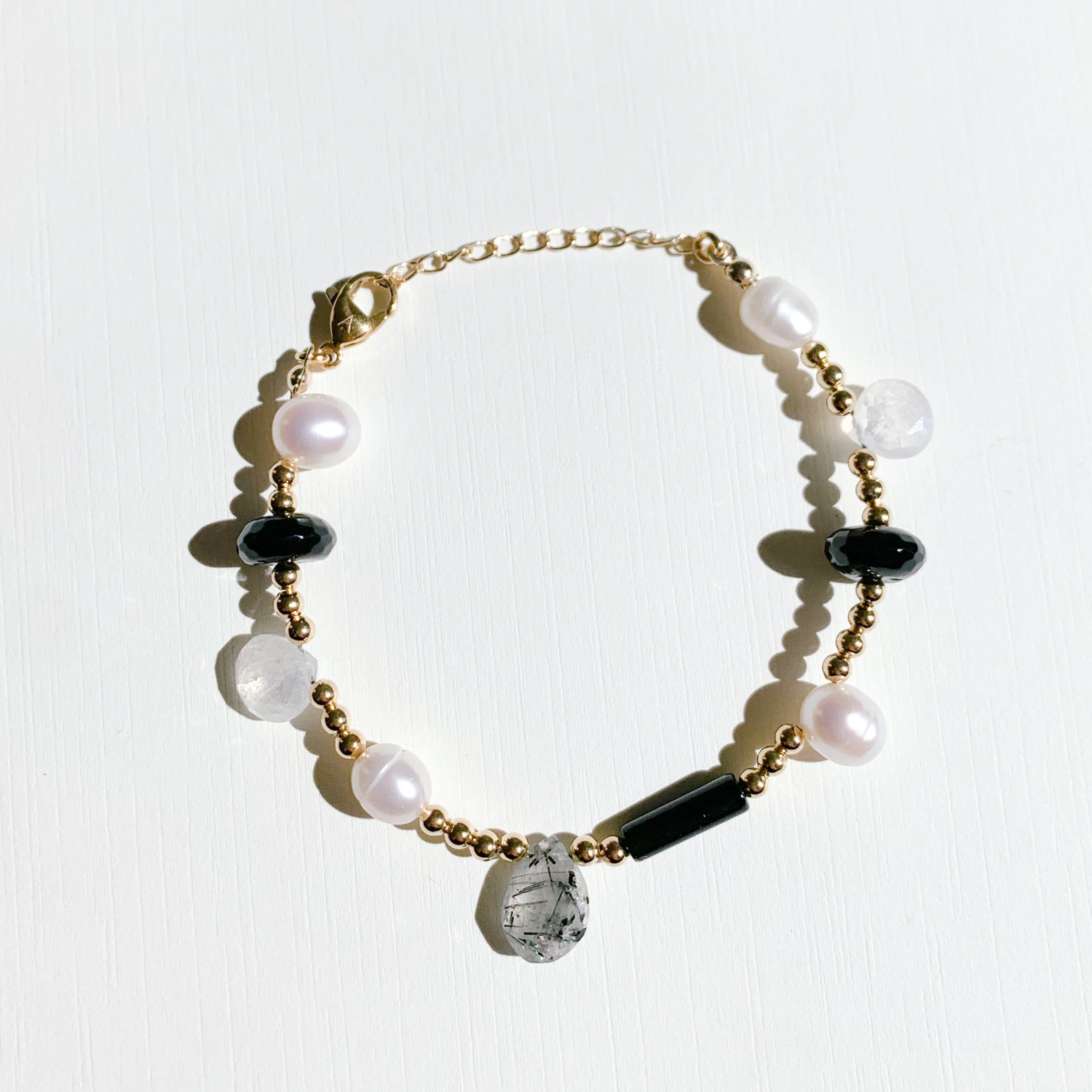 Materials: 18k Gold Plated Brass, Moonstone, Rutilated Quartz, Onyx, Freshwater Pearls.