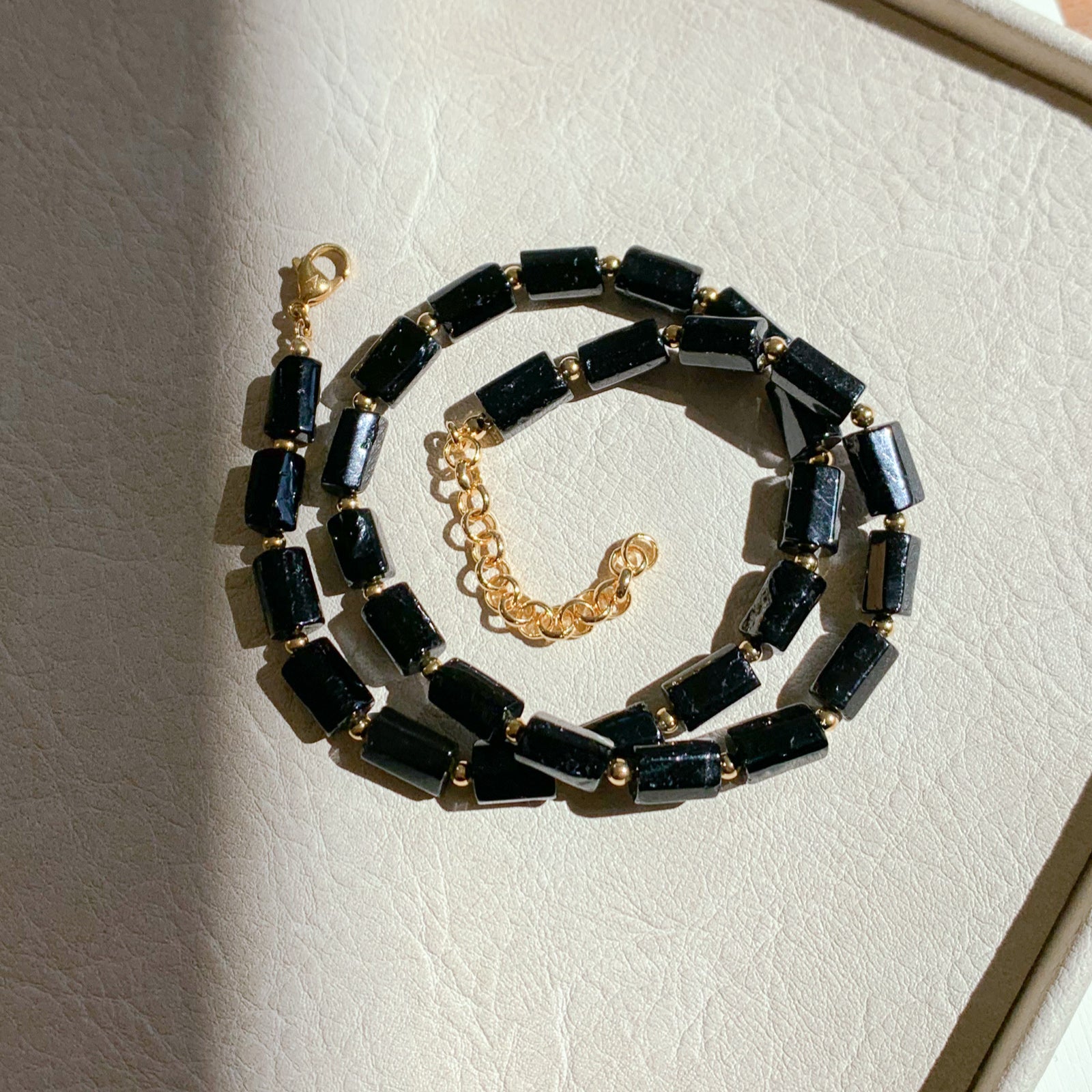 Handcrafted with rectangular black onyx beads and polished gold accents, the Noire Necklace is a modern classic. Its sleek silhouette and adjustable length make it perfect for layering or wearing solo — a timeless piece that adds quiet confidence to any look.