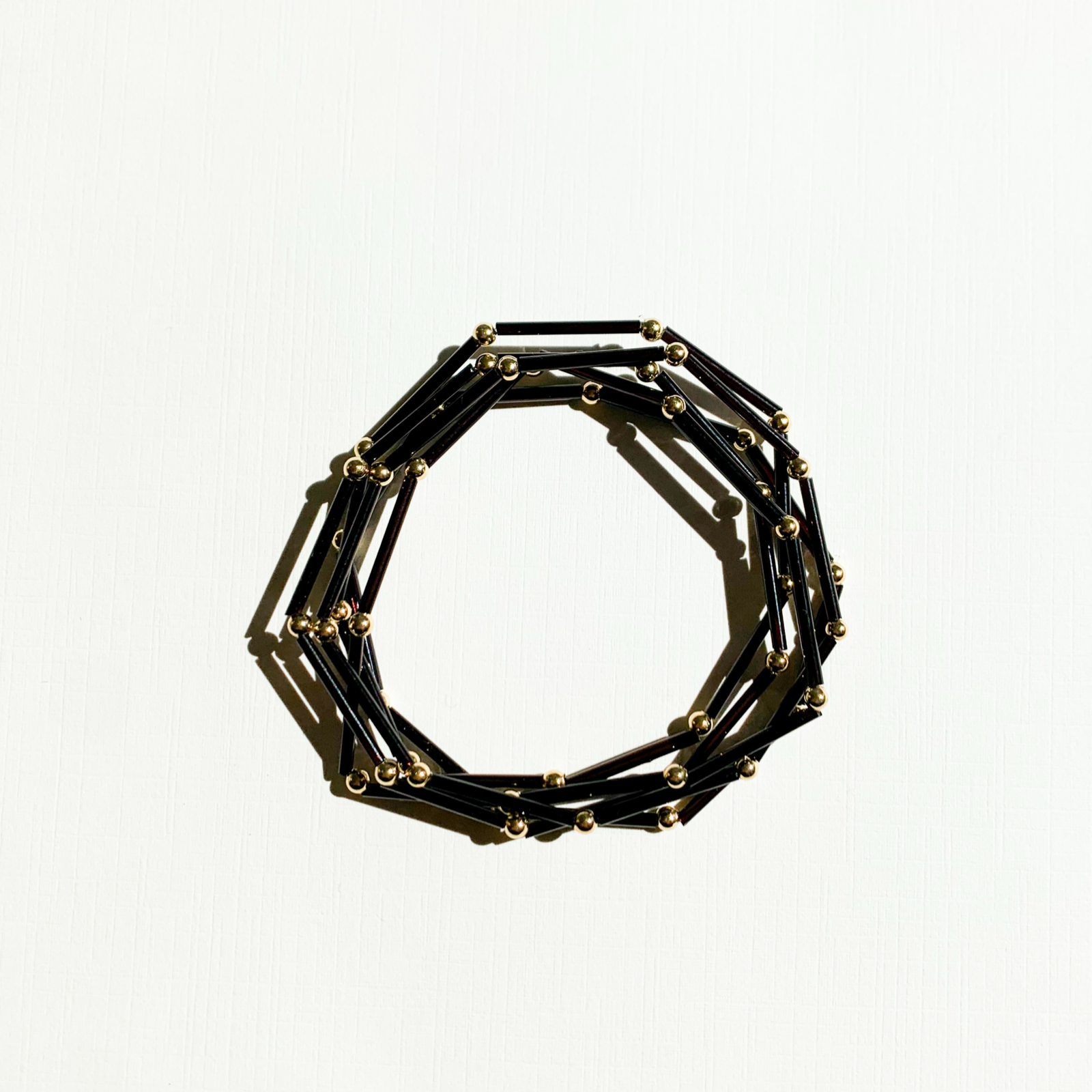 This collection features five expertly handcrafted elastic bracelets, each adorned with sleek black tube beads and refined gold accents. Its versatile design allows for effortless stack or wearing individually, making it a sophisticated accessory for both everyday wear and special occasions.