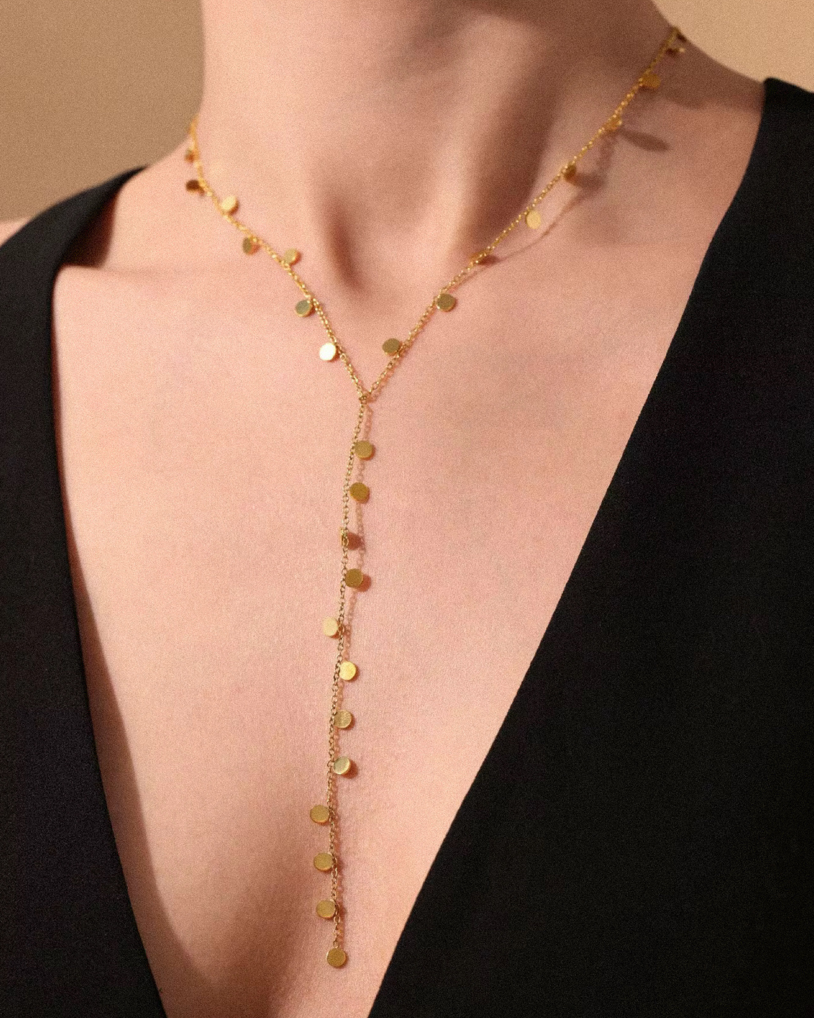 Crafted from 18k gold plated stainless steel, the Paige Lariat Necklace offers a delicate yet durable design that withstands water exposure. Its subtle sparkle and timeless elegance bring a refined, feminine touch to any ensemble, effortlessly elevating your look with sophistication.